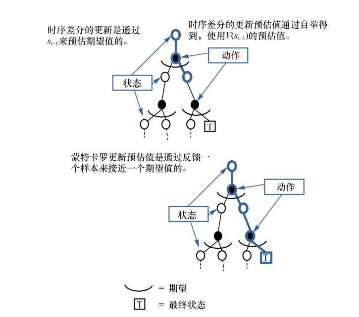 还重点对比了算法之间的差异,帮助读者更好地理解算法,例如时序差分方法和蒙特卡罗方法之间的差异。