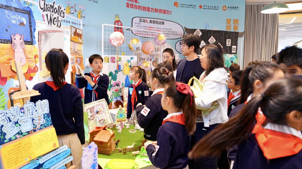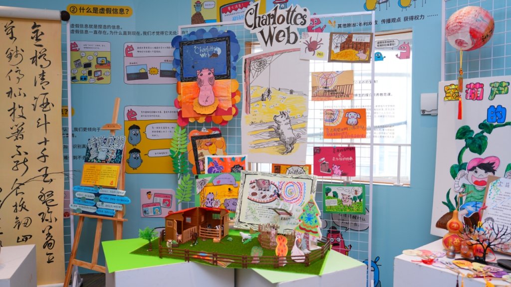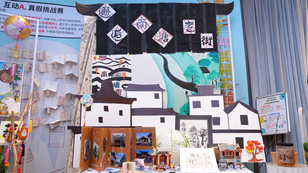 孩子们从“小书迷”化身“策展人”,开始了创意布展,模仿钟书阁、朵云书院的策展方式,以展板、互动体验打造沉浸式场景,让奇思妙想在彼此的指尖绽放:神话组的九色鹿场景、魔术小天团的“隐形药水”互动等,都让书页间的想象变成可触摸的体验。
