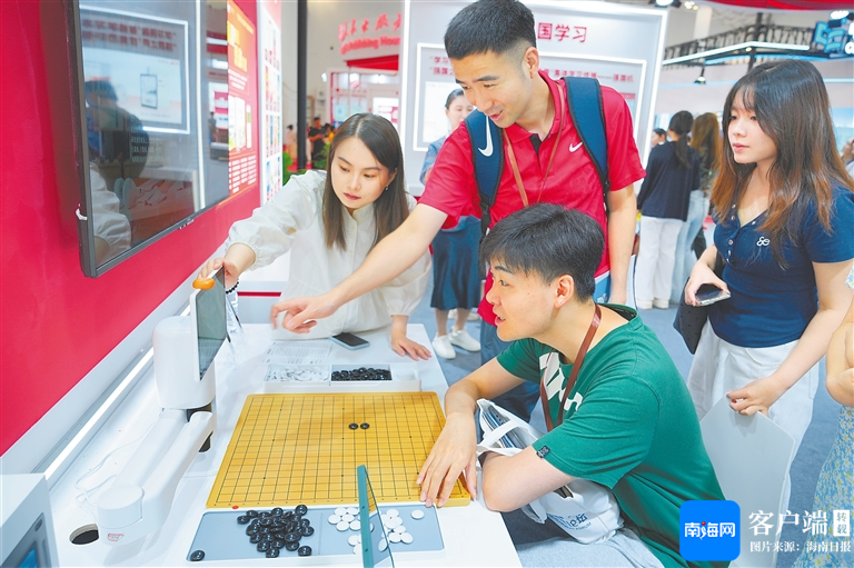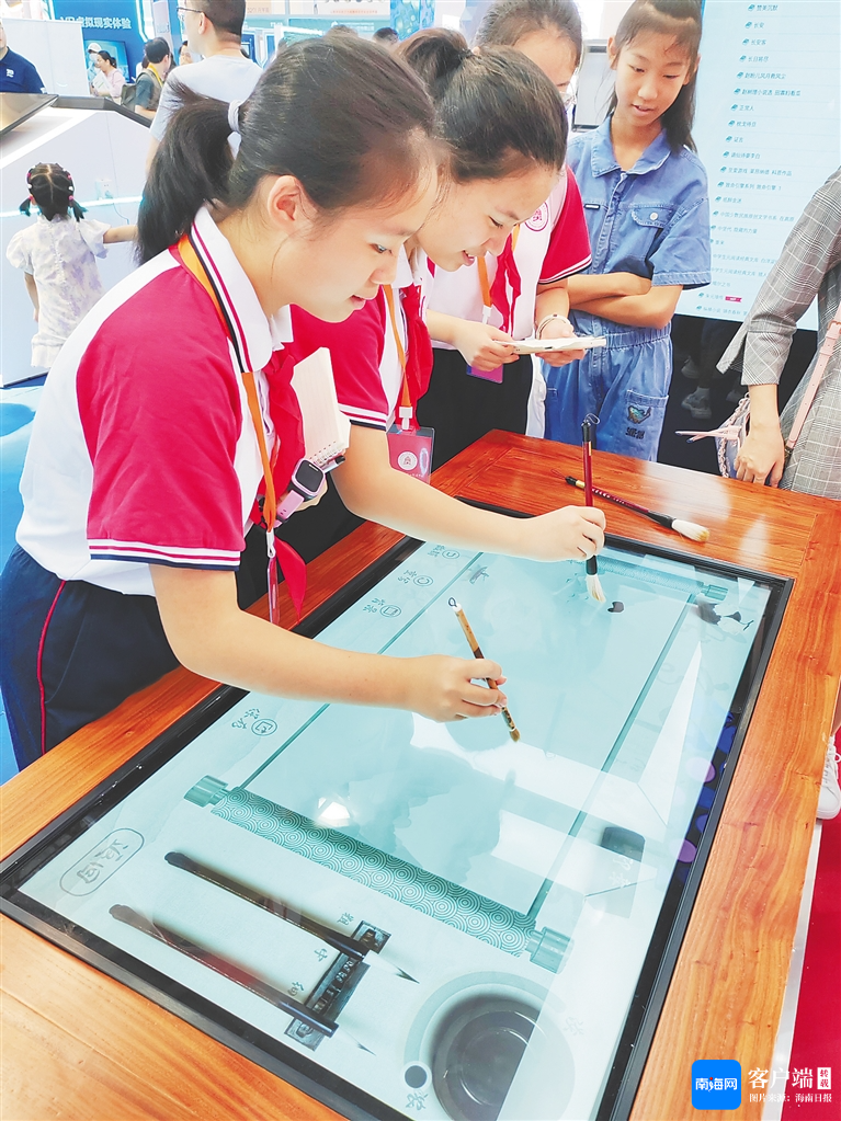 9月21日,在第十四届中国国际数字出版博览会海南展馆,观展学生在电子设备上提笔写毛笔字海南日报全媒体记者 王培琳 摄 出版业如何拥抱新技术? “如果把出版业新质生产力比作高速行驶的列车,那么数字出版就是这列列车的动力引擎。