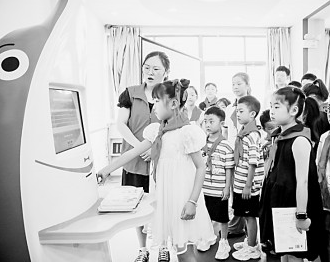 小读者在江苏如皋少儿图书馆体验图书自助借阅。徐慧摄/光明图片