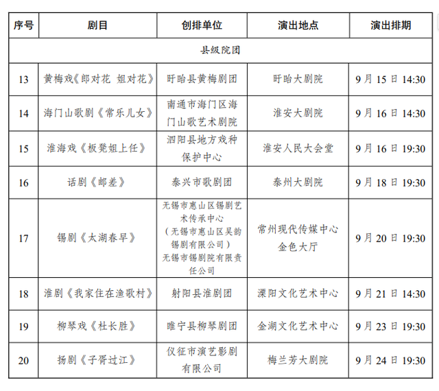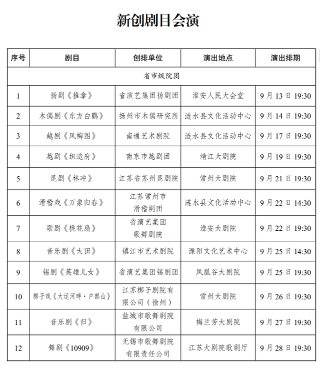 记者获悉,新创剧目会演作为艺术节的重头戏,今年更是亮点纷呈,涵盖了扬剧、木偶剧、越剧、昆剧、滑稽剧、歌剧、音乐剧、锡剧、梆子戏、舞剧、黄梅戏、海门山歌剧、淮海戏、话剧、淮剧、柳琴戏等众多剧种,可满足不同年龄、不同地域观众的多样需求。