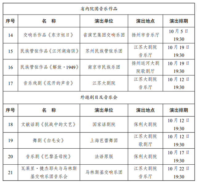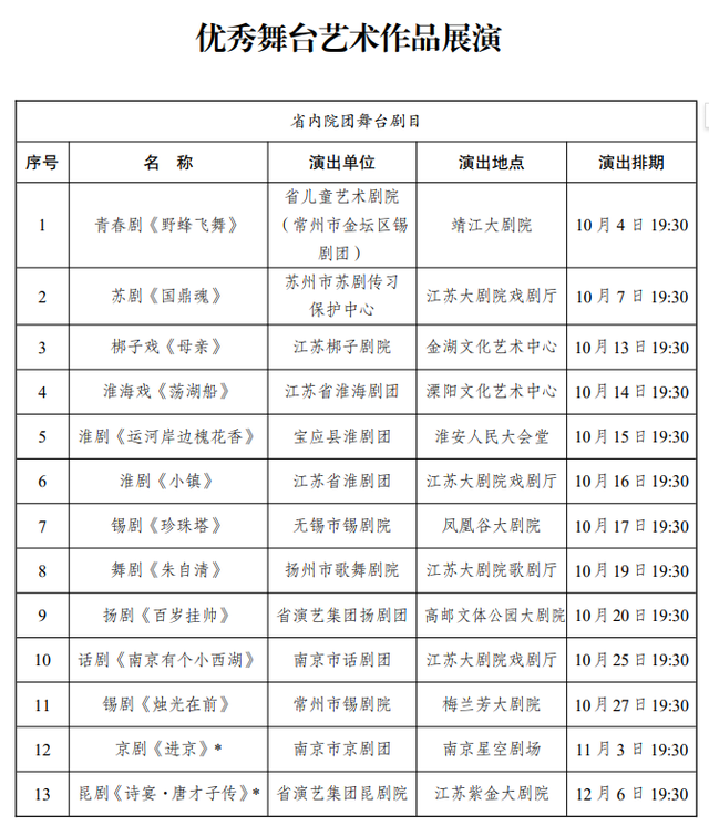 值得一提的是,为庆祝中华人民共和国成立75周年,在优秀舞台艺术作品展演板块,艺术节精心遴选了21部作品既有我省文艺院团倾力打造的苏剧《国鼎魂》、舞剧《朱自清》、话剧《南京有个小西湖》等,也有国家话剧院带来的文献话剧《抗战中的文艺》、法语原版音乐剧《巴黎圣母院》等外邀剧目,好戏连台定能让艺术爱好者们大饱眼福。