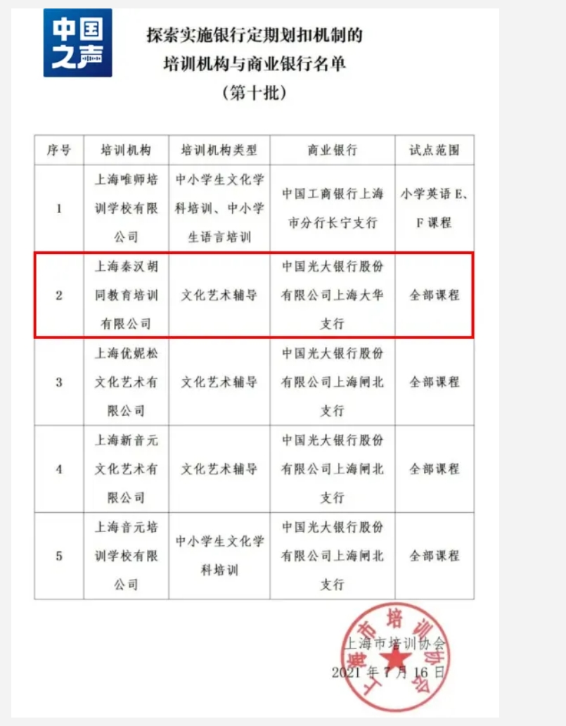秦汉胡同号称在银行开设监管账户实则未达成实质性合作2021年,上海市培训协会公布了一份“探索实施银行定期划扣机制的培训机构与商业银行名单”,称“为切实维护消费者的合法权益,消费者预付的培训资金由商业银行直接收取、保管。