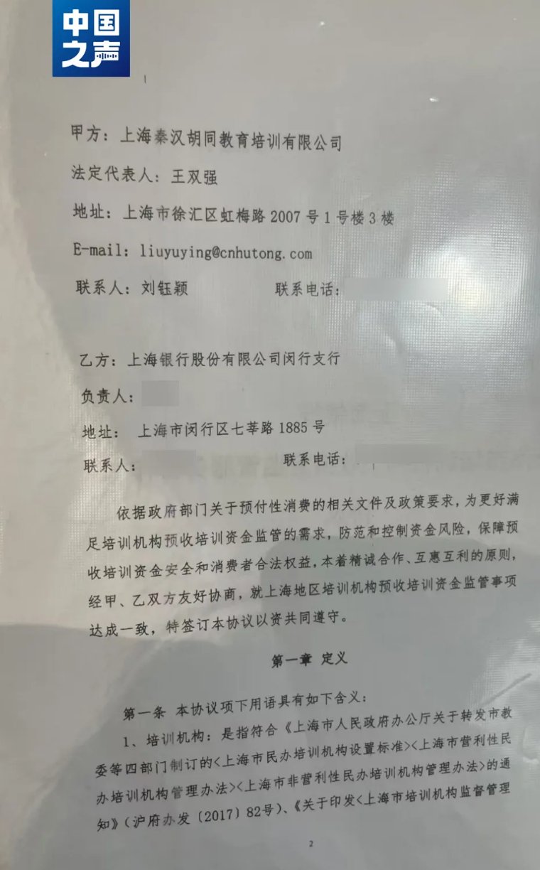 银行按照与消费者及培训机构的合同约定,将培训资金定期划扣至培训机构,消费者可以按照合同约定,要求商业银行停止后续培训资金的划扣”名单显示,秦汉胡同与光大银行上海大华支行有相关合作机制但家长给记者发来的一份合同显示,秦汉胡同又与。