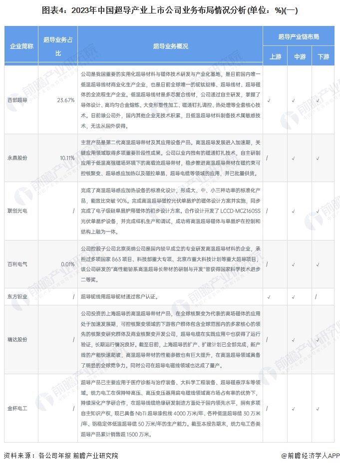 代表性企业超导业务布局对比随着国内企业技术研发的进步,我国超导产业企业数量逐渐增多,但整体产业链上企业数量还是较少,多数企业超导业务布局多个产业链环节,其中西部超导已实现全产业链布局,永鼎股份、联创光电、百利电气和金杯电工集中布局产业链中游及下游,